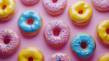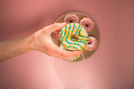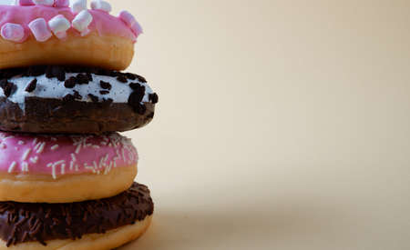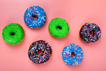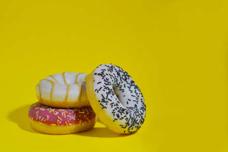 Donuts on a yellow background. Sweet donuts with different fillings. Sweet colorful tasty donuts with icing and sprinkles on pastel pink background.