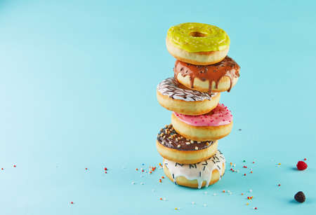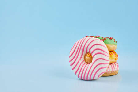 Close-up of fresh donuts stacked tilted by copy space against blue background. unaltered, unhealthy eating and sweet food concept.