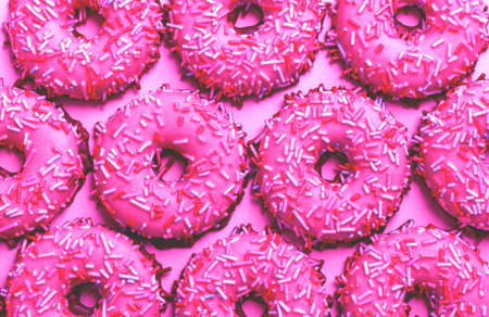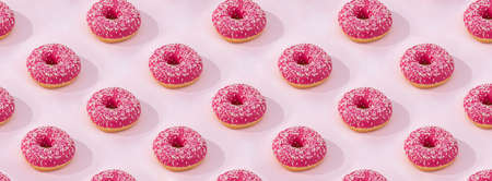 Pattern of Pink donuts with icing on pink background. flat lay.