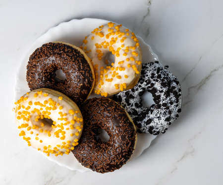 Overhead view of fresh multi colored donuts in plate over white background. unaltered, unhealthy eating and sweet food concept.