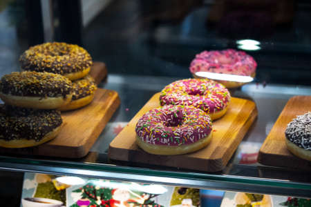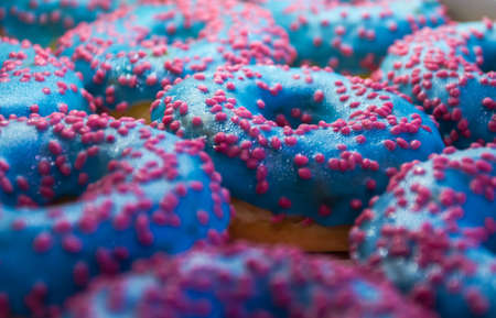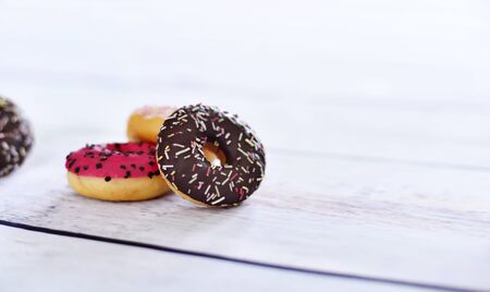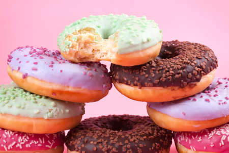 Fresh sweet doughnuts with multi colored icing and chocolate frosting. Fast food.