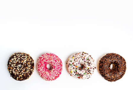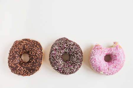 Different donuts with chocolate frosted, pink glazed and sprinkles on white background with copy space. Assortment of various colorful donuts. top view