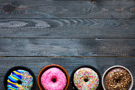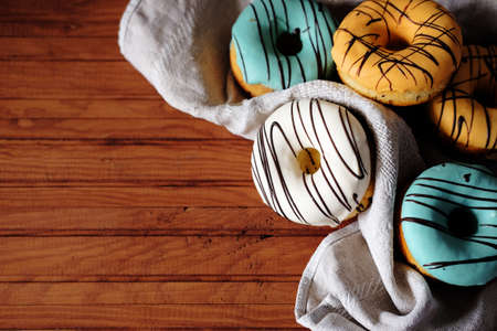 Colorful Donuts breakfast composition with different color styles of doughnuts over an aged wooden desk background.