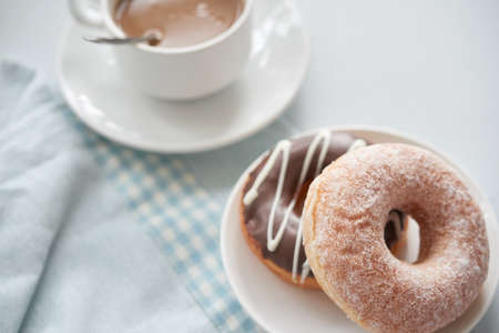 Above view of sweet glazed donuts on plate and brewed coffee with milk for breakfast