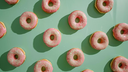 Directly above view of fresh donuts with sprinklers arranged by copy space on pink background. unaltered, unhealthy eating and sweet food concept.
