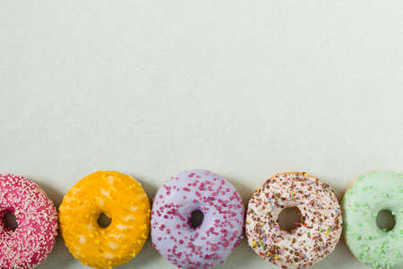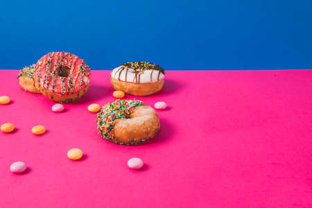 High angle view of fresh donuts with colorful sprinklers by copy space on colored background. unaltered, unhealthy eating and sweet food concept.