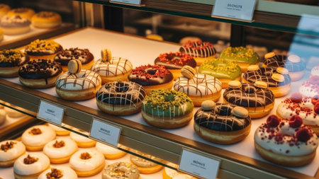 An assortment of decorated donuts are featured in a bakery display case. Various colors and toppings showcase the diverse selection. The composition highlights overhead lighting and a warm, inviting setting. Ideal for food-related projects and marketing materials.