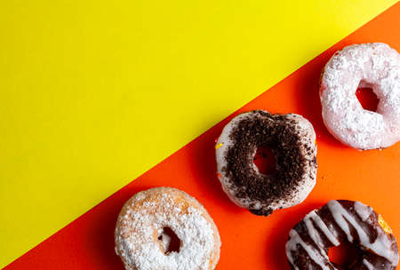 Assortment of decorative sweet fresh baked donuts on two colored background. The deserts with different finishings and toppings are on orange side while the yellow part is left blank for customization