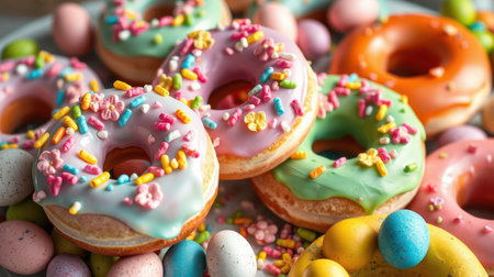 Colorful donuts topped with sprinkles and surrounded by pastel candy eggs on a decorative platter