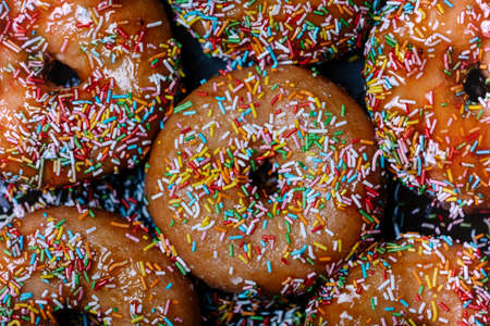 Delicious donuts with sprinkles. Fresh baked donuts. Tasty food background. Sweets and treats backdrop