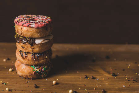 Heap of fresh donuts with glaze on a wooden table. Delicious unhealthy food. Multicolored glazed donuts with chocolate sprinkles and copyspace.