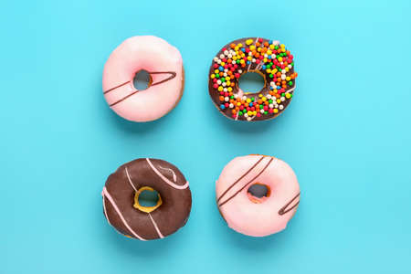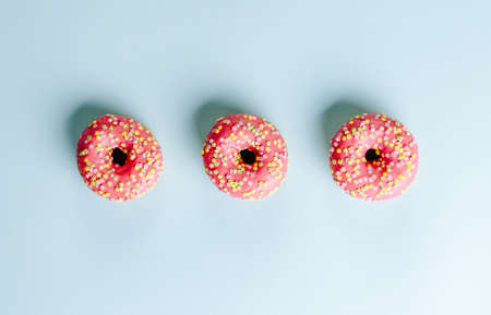 Classic chocolate, pink strawberry, decorated with colorful sprinkles donut isolated on blue background Flat lay Top View Knolling Unhealthy and tasty food concept Holiday card.