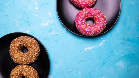 Mmm, so delicious. Top view of various colourful round glazed donuts with sprinkles on the plate over blue background