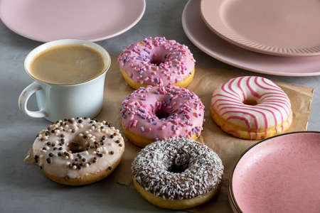 Several donuts lie on craft parchment paper on gray surface. Porcelain cup of coffee and pink plates stands next to donuts laid out on table. Selective focus.