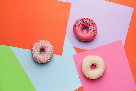 Donuts with icing on color background. Sweet donuts. Donuts background . Eaten donut.