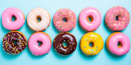 Sweet Indulgences: Vibrant Doughnuts Sprinkled on a Blue Canvas --AR 3:2