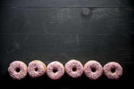 donuts with strawberry syrup and coloured topping seen from above on a black background