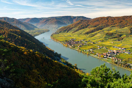 Vineyards and Donau river in Wachau valley Austria with autumn colored leaves small traditional village on sunny day. Traditional wine and tourism region,