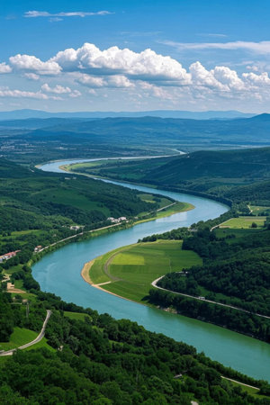 Beautiful summer landscape with river and mountains. View from above.