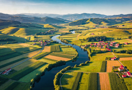 An aerial view captures a winding river passing through a green valley dotted with houses and surrounded by rolling hills under a bright sky.