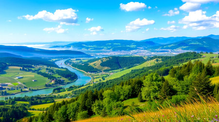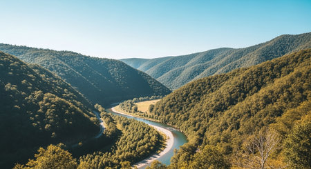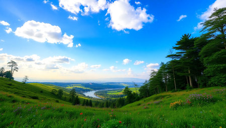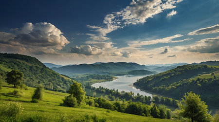 A serene landscape featuring lush hills and a winding river under a bright sky.