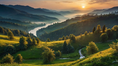 A misty river winding through a quiet valley.