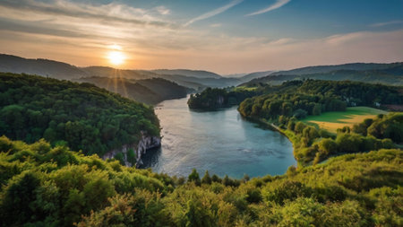 Panoramic view of the Danube river and the forest at sunset