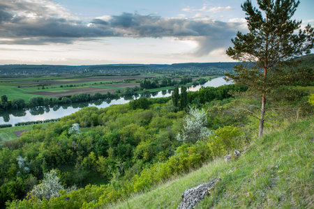 Splendid blooming meadow near the Dniester river at sunset. Location place Dnister canyon of Ukraine, Europe. Clouds illuminated by the beams of the sun. Photo wallpaper. Discover the beauty of earth.