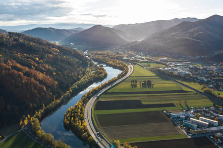 Aerial view of the river Mur near Graz with the hydroelectric power plant in Peggau-Deutschfeistritz