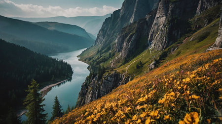 Panoramic view of the valley and the river in the mountains