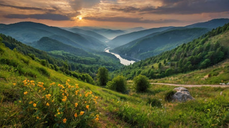 Beautiful summer landscape with a river in the mountains at sunset.