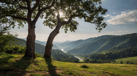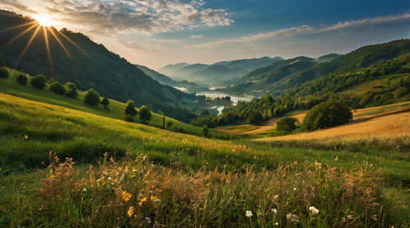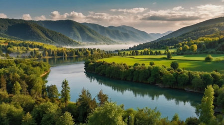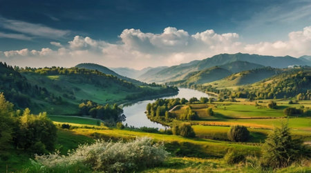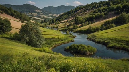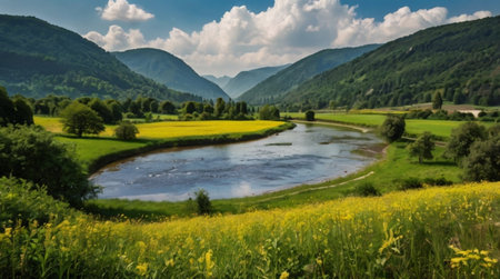A river running through a lush green valley. Generative AI image.