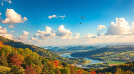 An aerial view captures a serene autumn river valley bathed in warm, golden sunlight. A wide, calm river meanders through the landscape, its surface reflecting the clear blue sky. The surrounding hills are densely covered with a vibrant mix of autumn trees, displaying hues of yellow, orange, and green. A gentle mist or haze hangs in the air, softening the distant hills and creating a sense of depth and atmosphere. Sunbeams pierce through the mist, illuminating patches of the forest. The...