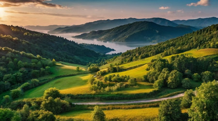 Beautiful summer landscape in the mountains at sunset. Panoramic view