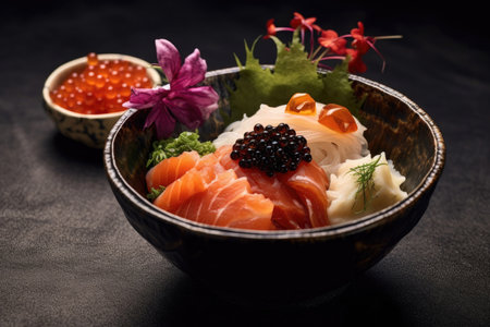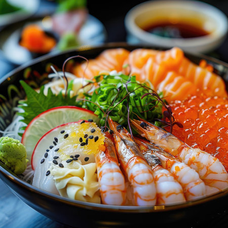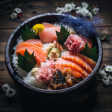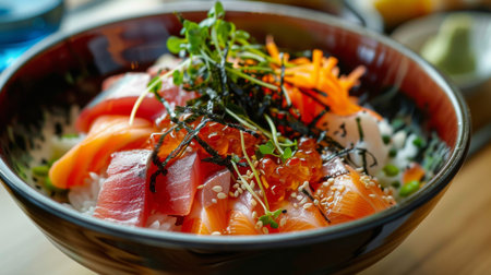 Close-up of a mouth-watering seafood chirashi sushi bowl, capturing the essence of Japanese cuisine