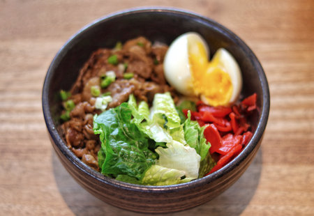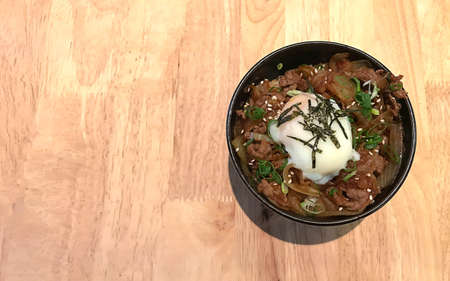 Japanese beef bowl with onion and soy ingredients in Japanese style food with egg on top call gyudon ready to eat.
