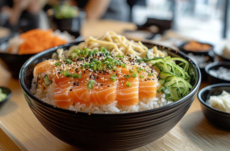 A vibrant sashimi bowl featuring fresh fish, rice, and toppings, ideal for food lovers and culinary enthusiasts. Perfect for healthy dining options.