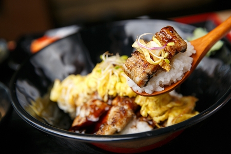 Famous of Japanese food , Unagi on top Japanese rices in bowl , Grilled eel in the restaurant