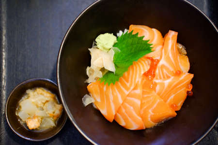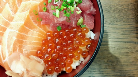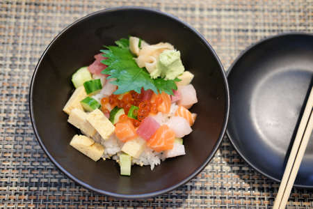 Japanese food with raw fishes called sashimi on the rice in bowl