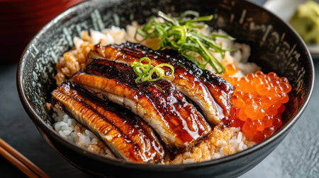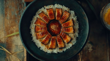 A stunning presentation of grilled eel atop a bed of sushi rice, beautifully arranged in a rustic bowl on a wooden table, highlighting delicious Japanese cuisine.