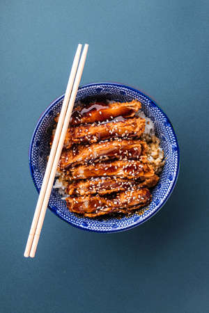 Katsu with rice on a rectangular plate. Japanese food. Selective focus.