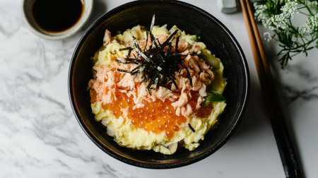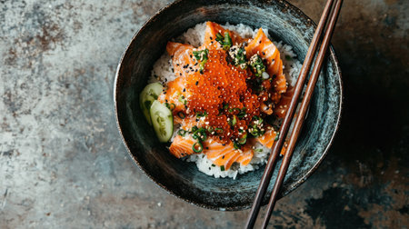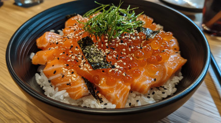 Indulge in a stunning traditional Japanese donburi featuring fresh salmon and vibrant roe. This visually captivating dish highlights culinary artistry and delicious flavors.
