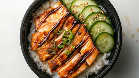 A top down view of a delicious salmon fillet served over rice, accompanied by fresh cucumber slices and garnished with green onions and sesame seeds. Perfect for food enthusiasts.