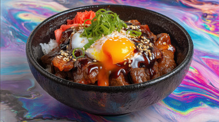 A vibrant and appetizing bowl of beef rice, adorned with a perfectly cooked egg, sesame seeds, and fresh herbs, set against a colorful background for a culinary delight.