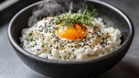 A bowl of steaming Japanese white rice topped with a fresh raw egg yolk and sprinkled with seaweed flakes and sesame seeds