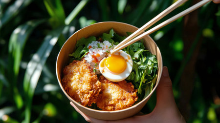 A hand holds a bowl filled with crispy fried chicken, a soft boiled egg, and vibrant salad greens. The food is surrounded by lush greenery, creating a refreshing outdoor dining experience.