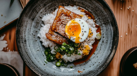 A delicious bowl of rice topped with a soft-boiled egg, savory meat, and garnished with scallions and sesame seeds. Perfect for any meal.