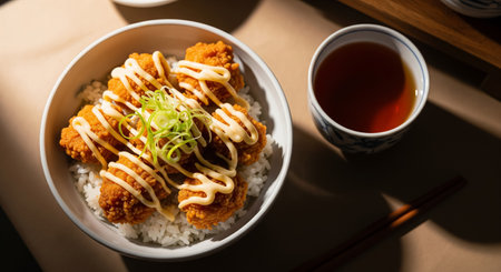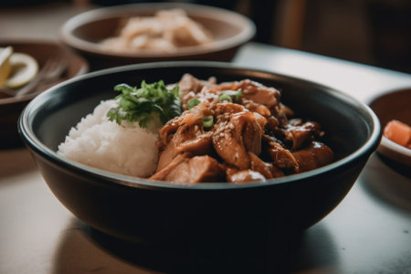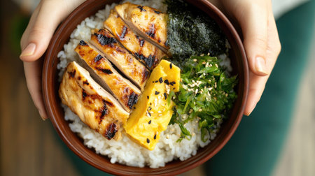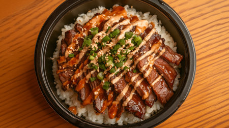 A mouth-watering rice bowl filled with succulent grilled meat, drizzled with flavorful sauces and fresh garnishes, perfect for food lovers seeking delicious comfort food.