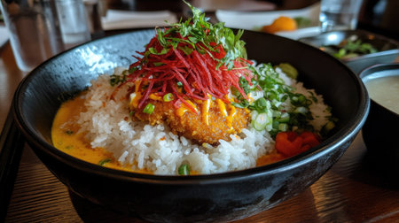 A visually appealing Japanese curry rice bowl topped with fresh vegetables and garnished with sesame seeds, perfect for a delicious meal experience.