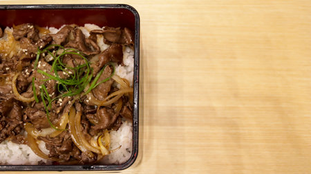 Gyudon is one of the Japanese comfort food in which sliced beef and onion simmered in sweet and salty sauce made of soy sauce and sugar are topped on warm rice. boxed don.
